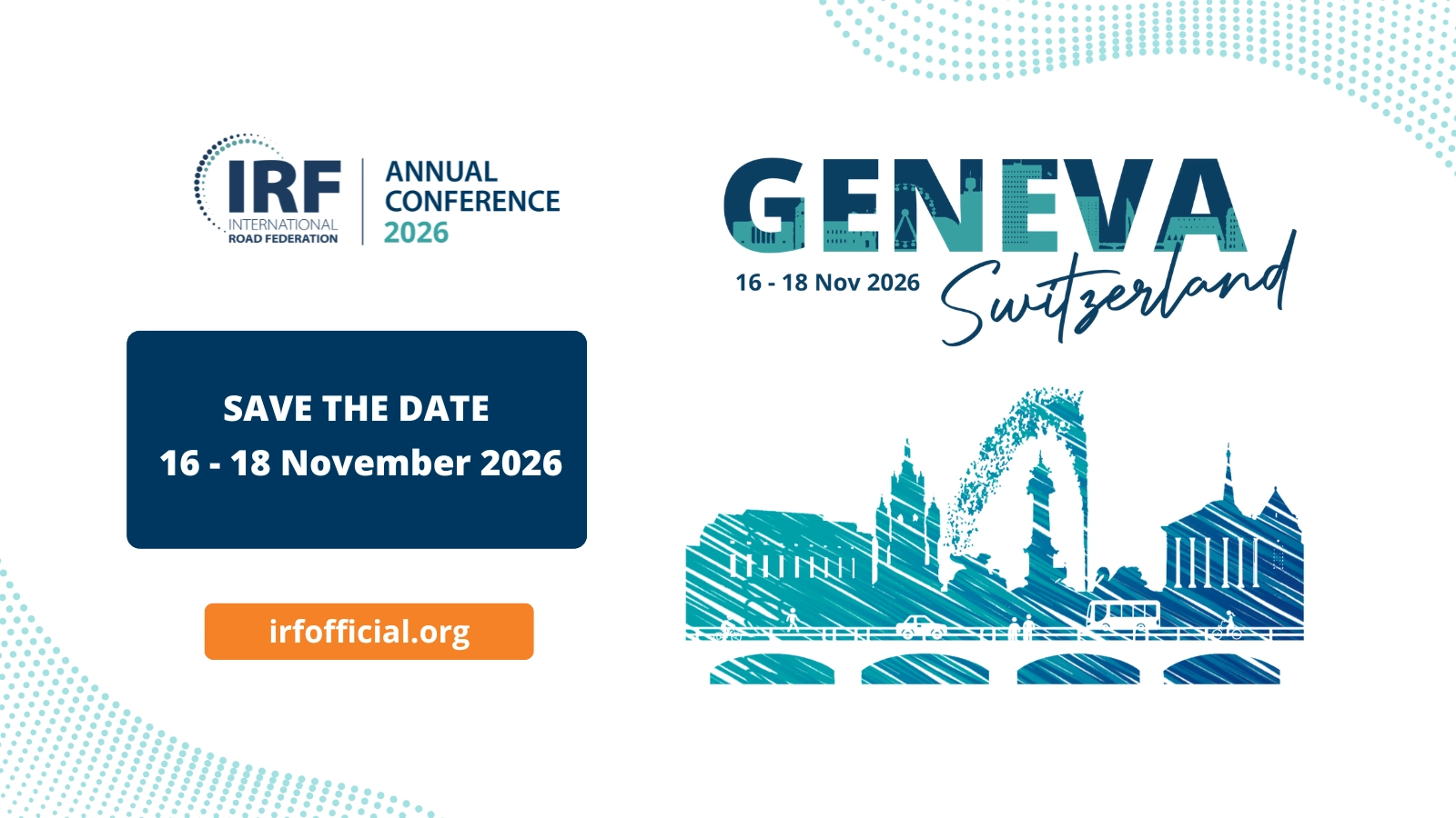 The International Road Federation (IRF) will host the IRF Annual Conference in Geneva bringing together a diverse international and national audience to discuss the future of road networks and services within the framework of the United Nations Decade of Sustainable Transport 2026–2035.